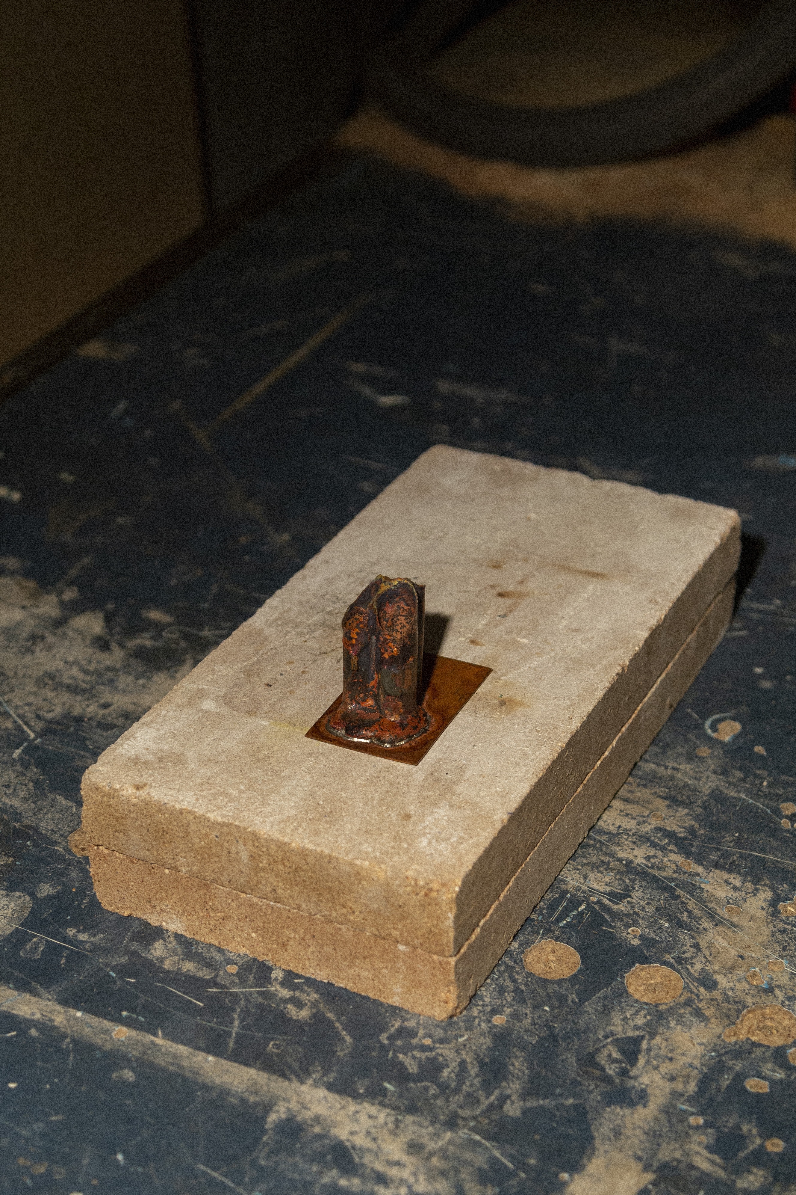 This small universal holder is made out of copper heater tubes. 3 small tubes are melted together in a kiln, and then soldered to a flattened piece of tube, just like the tubes of a hot water system.