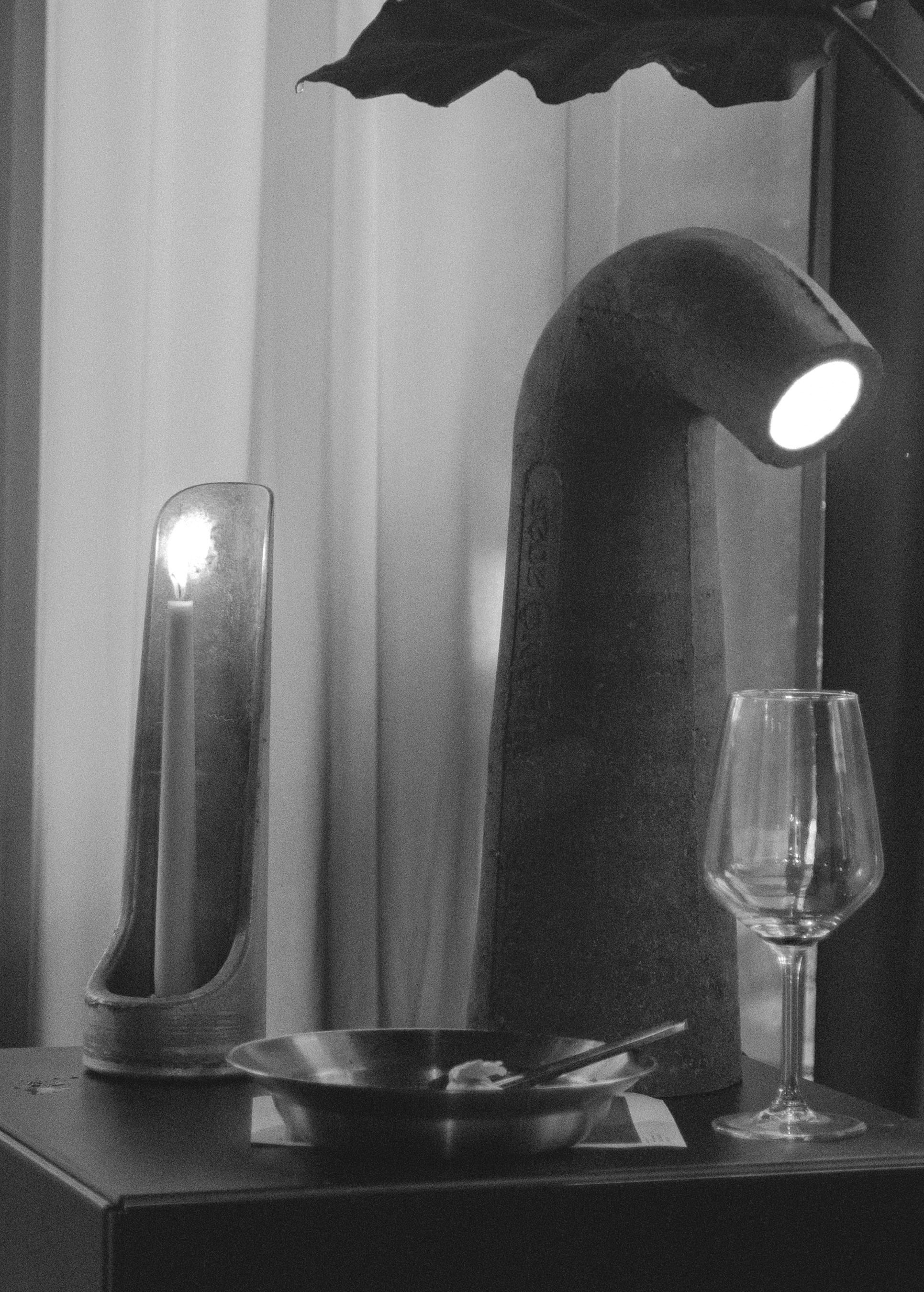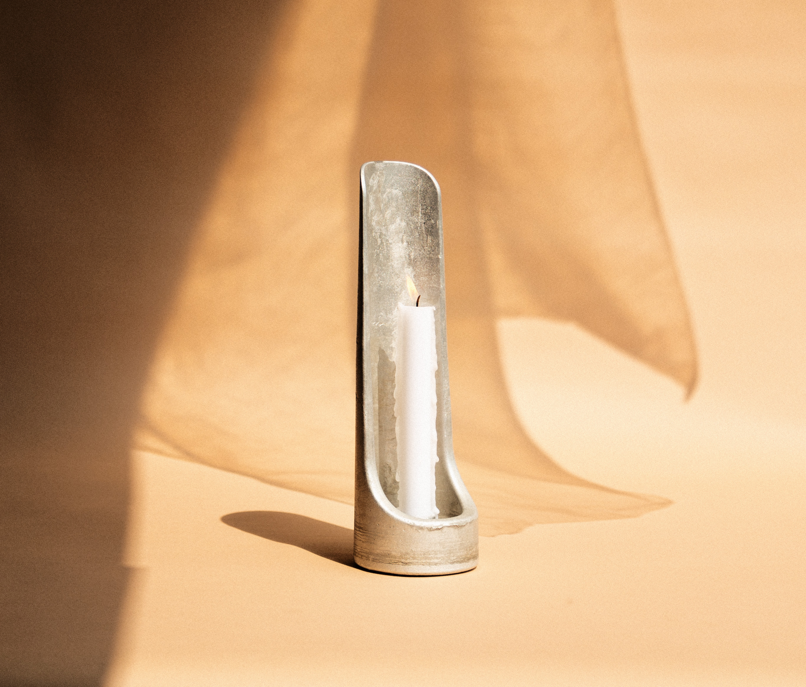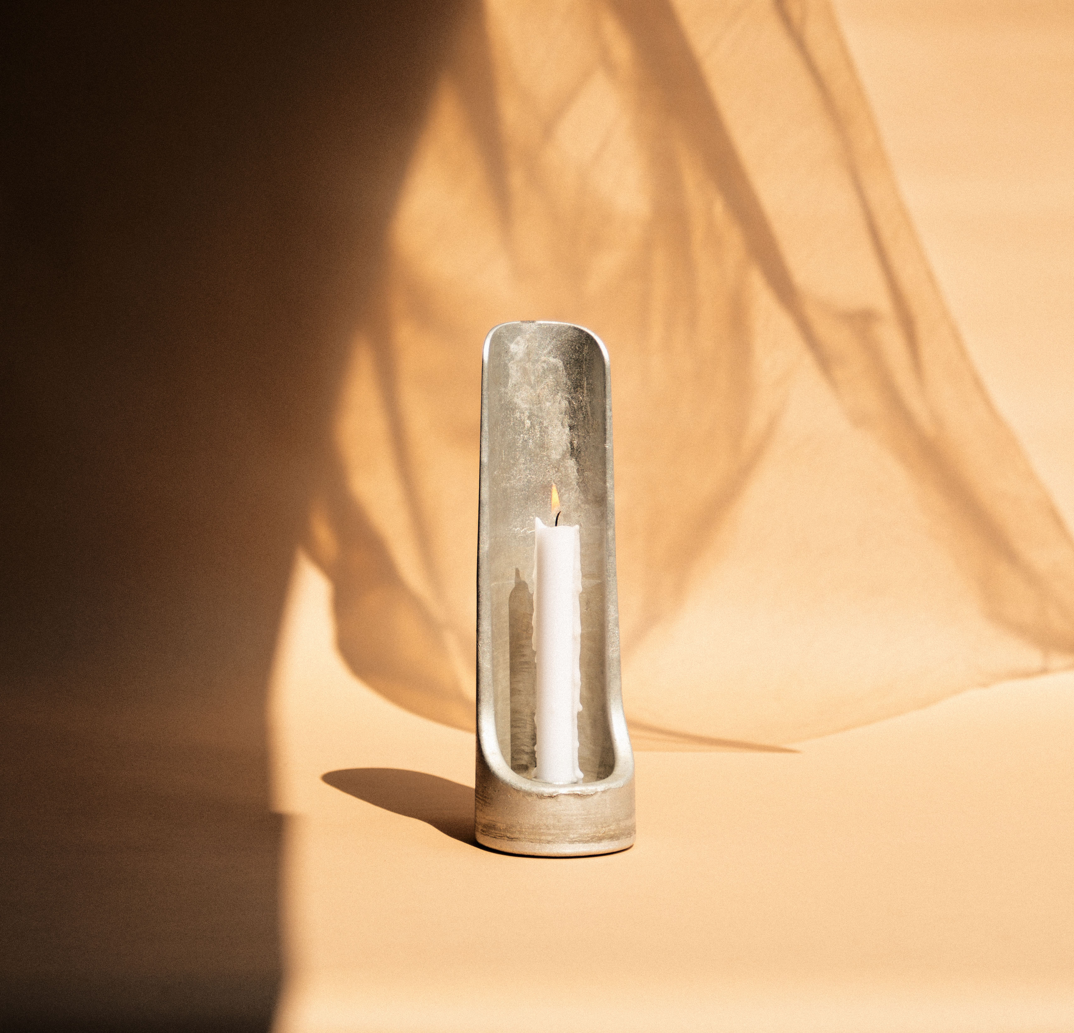 Cast from recycled aluminum, this candle holder draws inspiration from the reflection of light and takes shape through experimental cuts of silhouettes from circular forms.